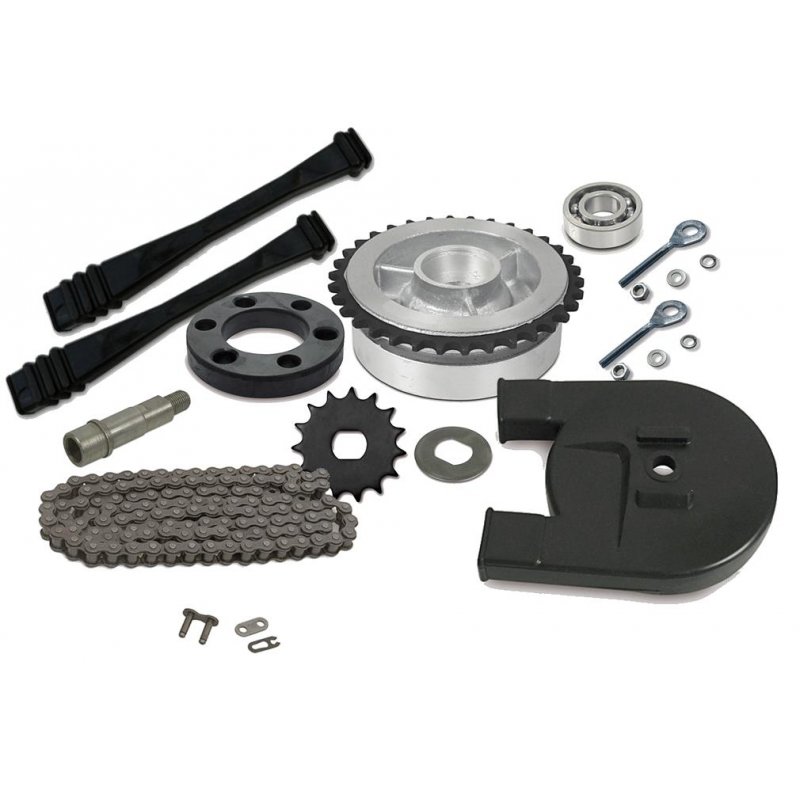 - Der Satz besteht aus 1 xKette 110 Glieder, Kettenkasten mit Deckel, 2x Kettenschlauch, Mitnehmer 34 Zahn mit montierten Kugellager, Mitnehmergummi, Achsverlängerung, Ritzel 15 Zahn, Sicherungsblech, Mutter M12. Scheibe, 2xKettenspanner, Mutter M18x1